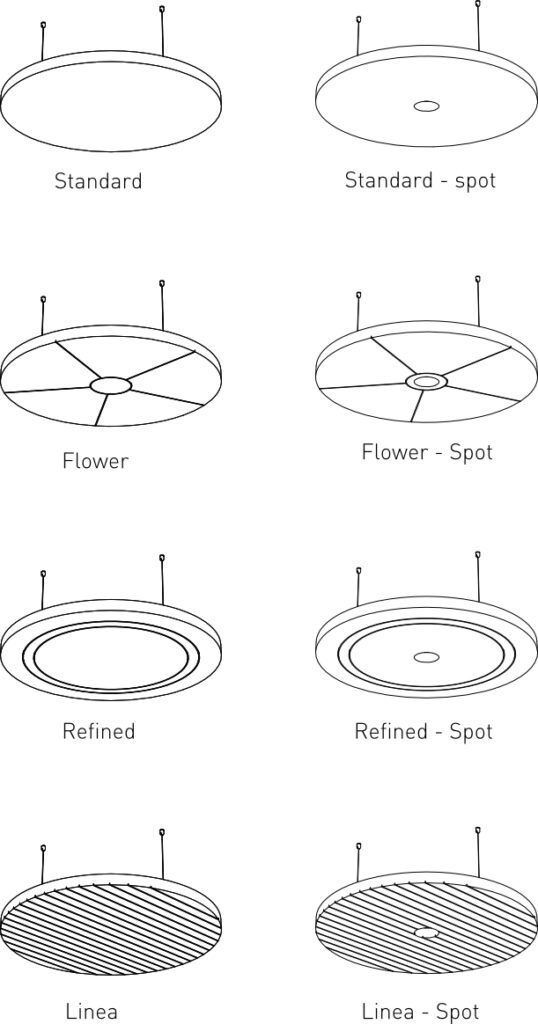 En option, des spots intégrés, disponibles en trois teintes de couleurs, permettent d’associer élégamment acoustique et éclairage.